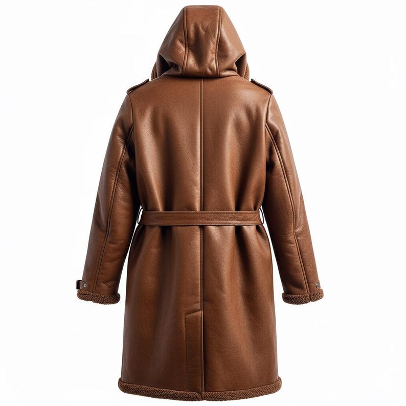 The Men’s Distressed Brown Genuine Sheepskin Sherpa Shearling Faux Fur Warm Hooded Belted Smooth Mid-Length Leather Coat redefines winter luxury. Crafted from high-quality distressed brown genuine sheepskin, it promises not only warmth but also a touch of refined ruggedness. The inclusion of a Sherpa Shearling faux fur-lined hood adds a layer of elegance and practicality, making this coat a standout piece for colder climates. The adjustable waist belt allows for a tailored fit, highlighting the coat’s sleek design while ensuring maximum comfort. Practical features like mid-length coverage and strategically placed slanted pockets enhance its functionality, making it ideal for daily wear or special occasions. Fully lined with Sherpa Shearling faux fur.”