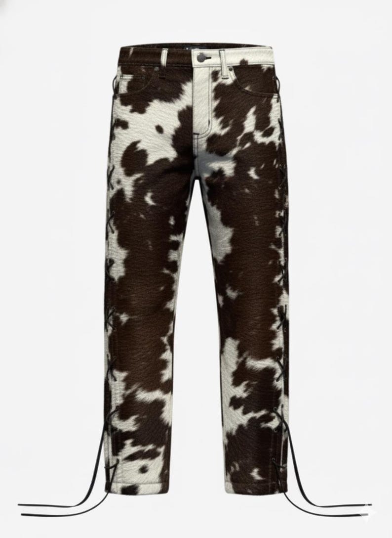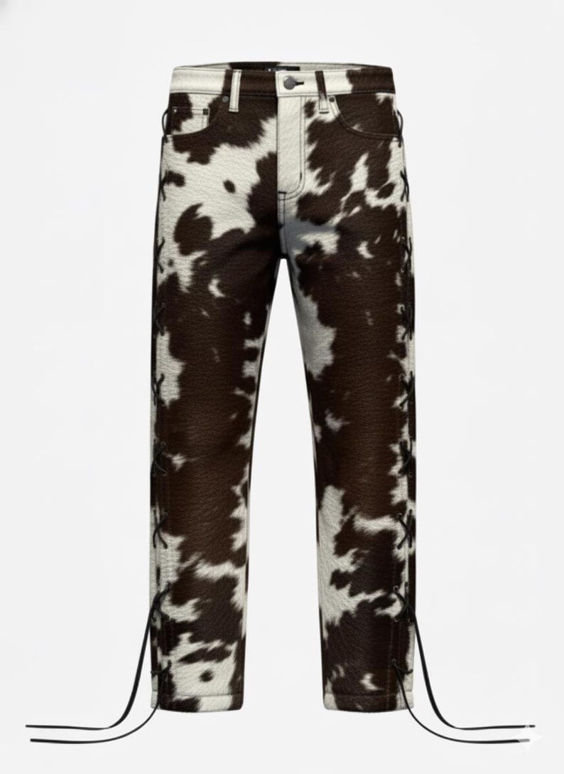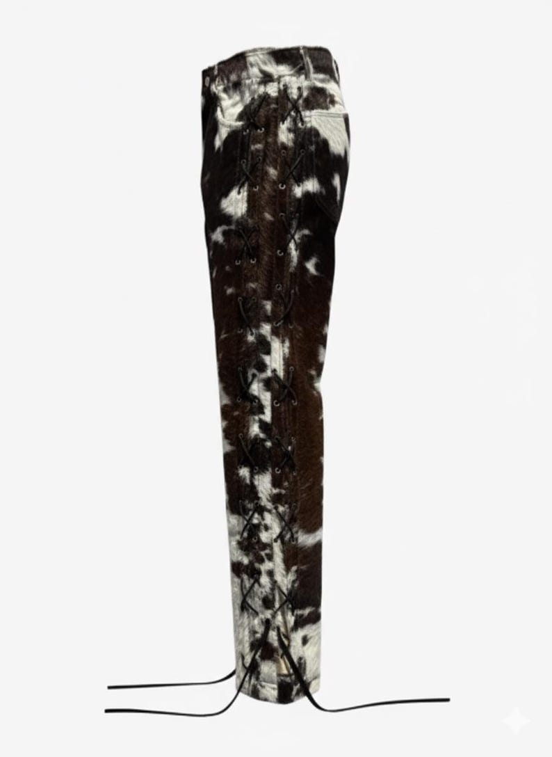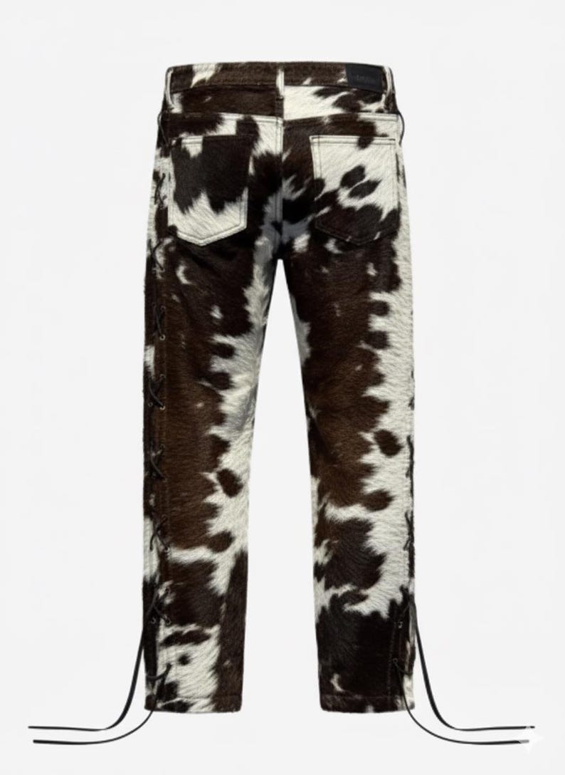 “Crafted from ๐Ÿ๐ŸŽ๐ŸŽ% ๐ ๐ž๐ง๐ฎ๐ข๐ง๐ž ๐œ๐จ๐ฐ๐ก๐ข๐๐ž ๐ฅ๐ž๐š๐ญ๐ก๐ž๐ซ with natural hair on hide texture, these pants offer unmatched durability, warmth, and a bold western aesthetic. Each pair is handmade, ensuring that no two are exactly alike your pants will be a unique statement of rugged luxury. The high-quality leather used is top-grain and ethically sourced, offering softness, structure, and long lasting wear.