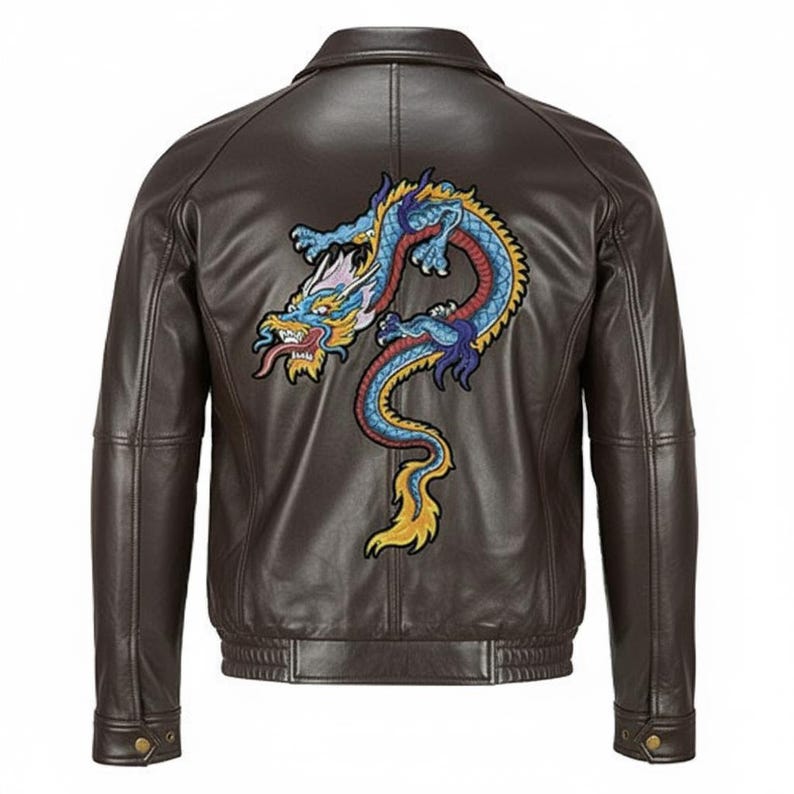 Each jacket is made from premium genuine leather and carefully detailed with vibrant stitching that brings the dragon to life — symbolizing power, strength, and good fortune.