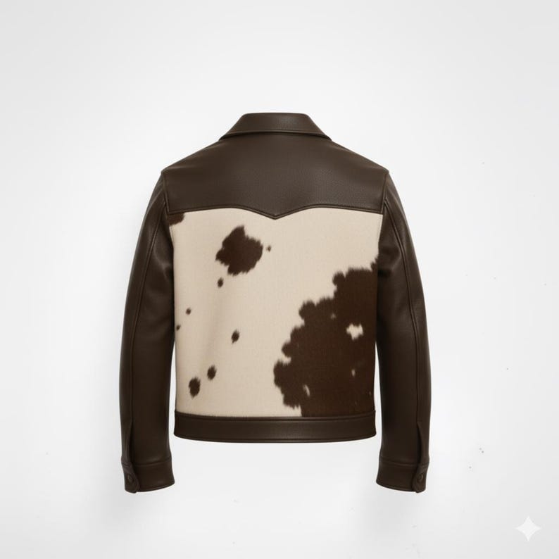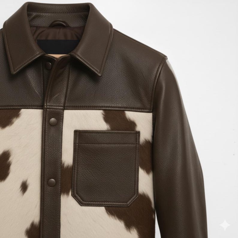 “Make a bold statement with this brown & white cowhide leather jacket a perfect fusion of western charm and modern street style. Crafted from real hair on cowhide each jacket has a one of a kind pattern making yours truly unique.