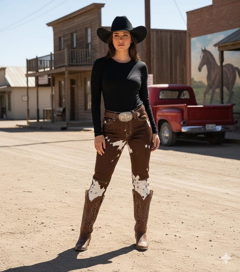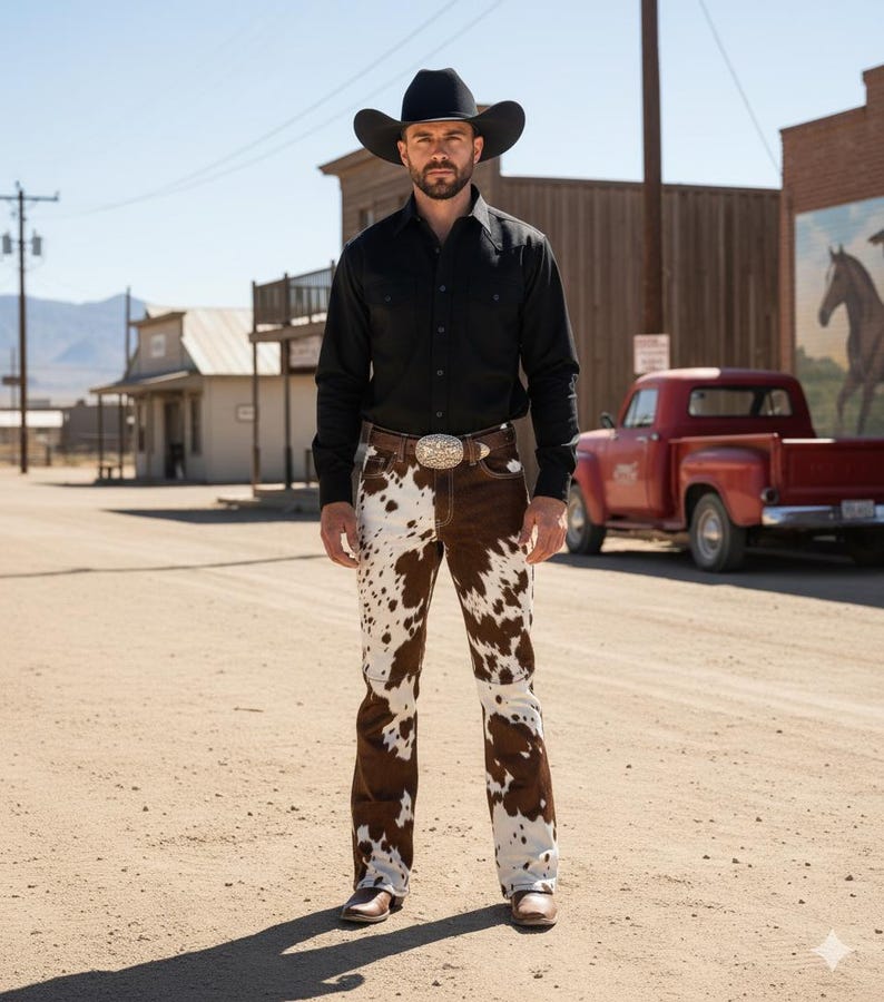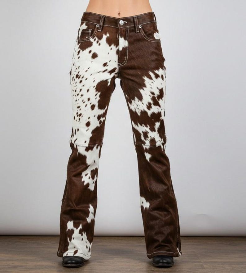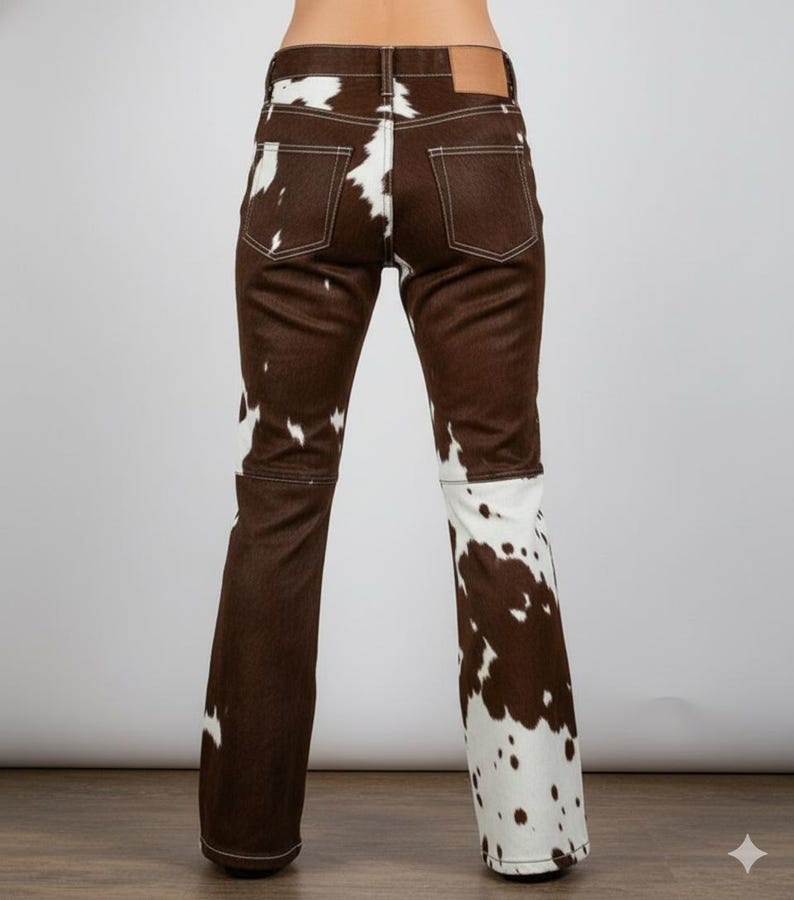 “The Cowhide Flared Pants are crafted from 100% cowhide fur, featuring a bold flared silhouette and a unique natural pattern, ensuring each piece is one-of-a-kind.