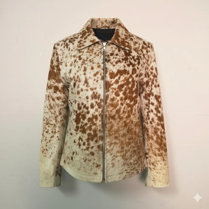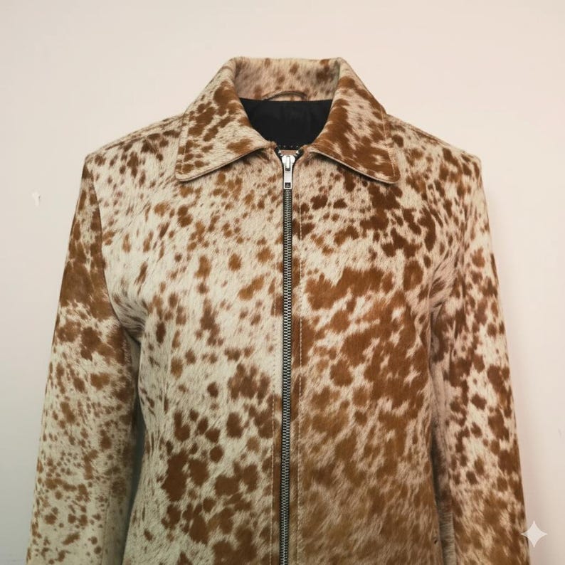 “Elevate your outerwear with this one-of-a-kind handcrafted cowhide leather jacket made from genuine hair-on hide. Each piece features a unique brown and white spotted pattern, ensuring no two jackets are ever alike. Designed for both men and women, this natural cowhide coat blends rustic charm with modern style — perfect for casual wear, country fashion, or standout street looks.