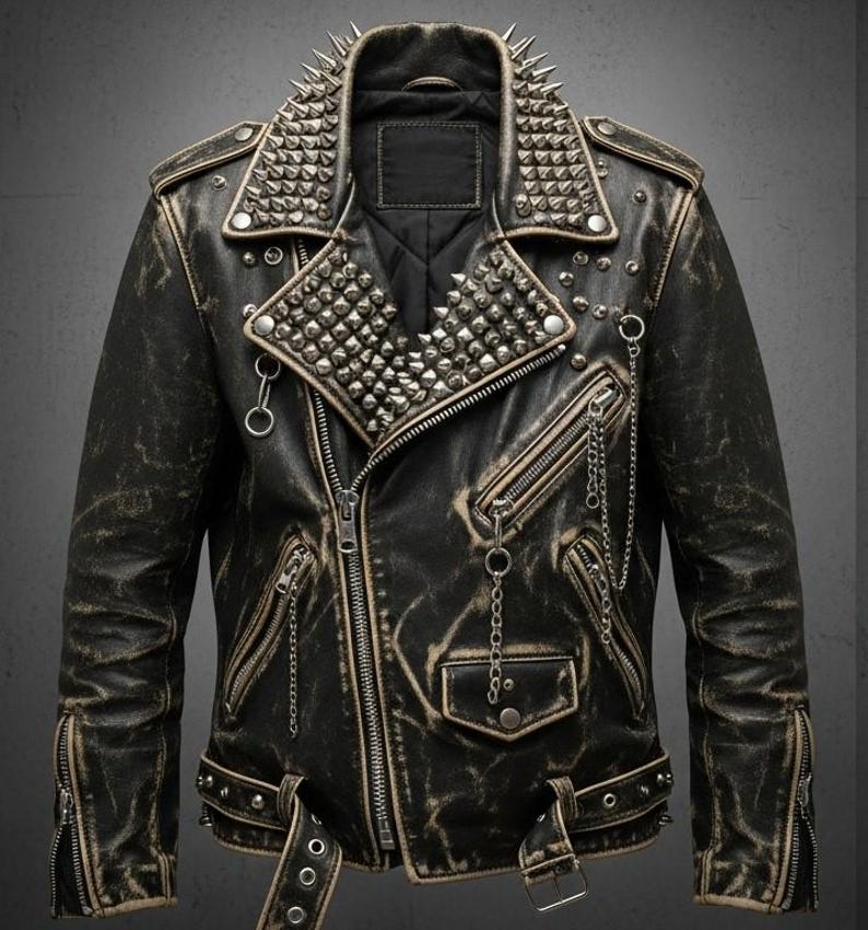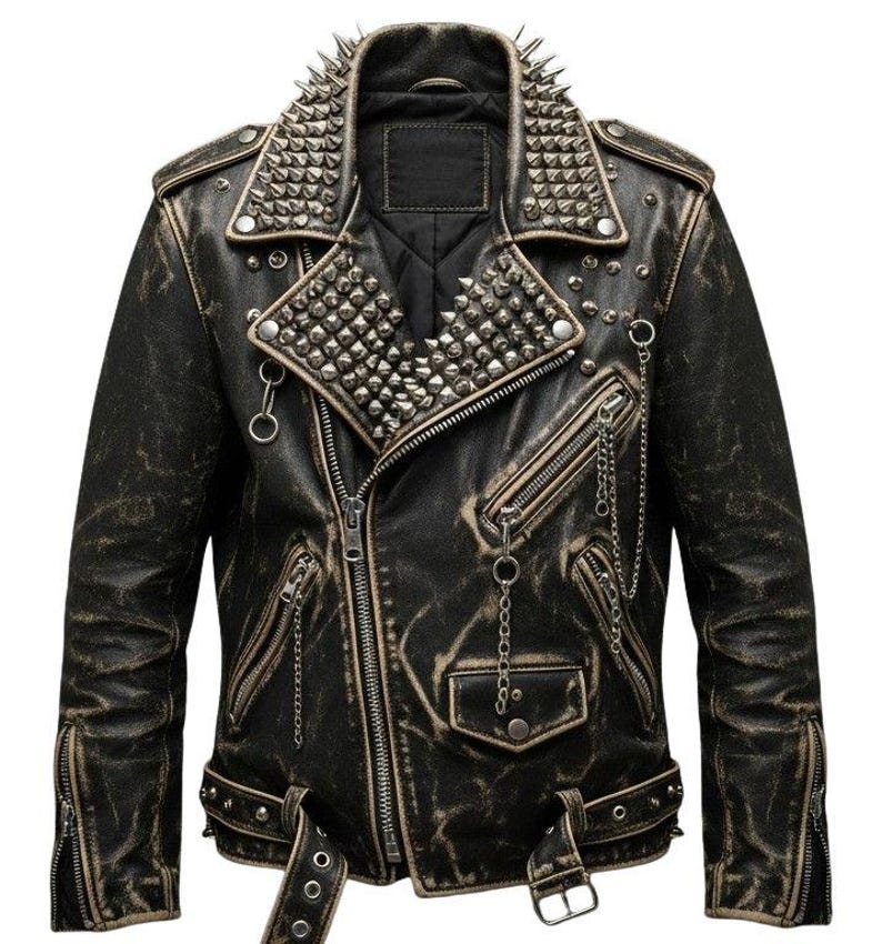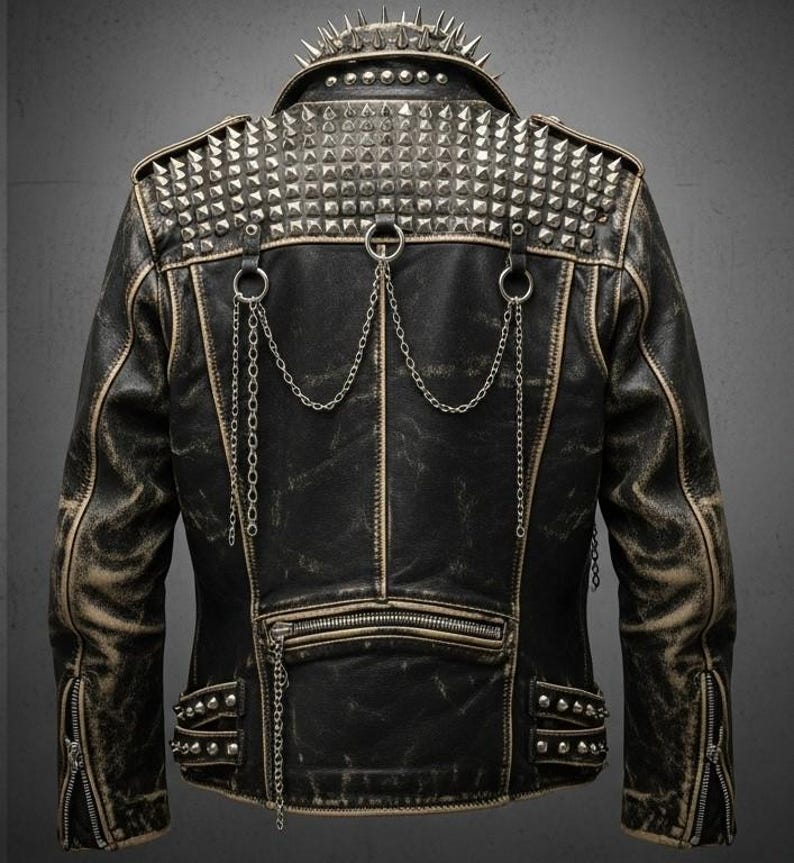 “Turn heads with this bold, handcrafted studded punk biker jacket. Designed for those who love expressive fashion, this jacket features dramatic spikes, heavy metal-style studwork, chains, and a rugged distressed finish. Perfect for concerts, photoshoots, festivals, or adding statement style to your everyday look.