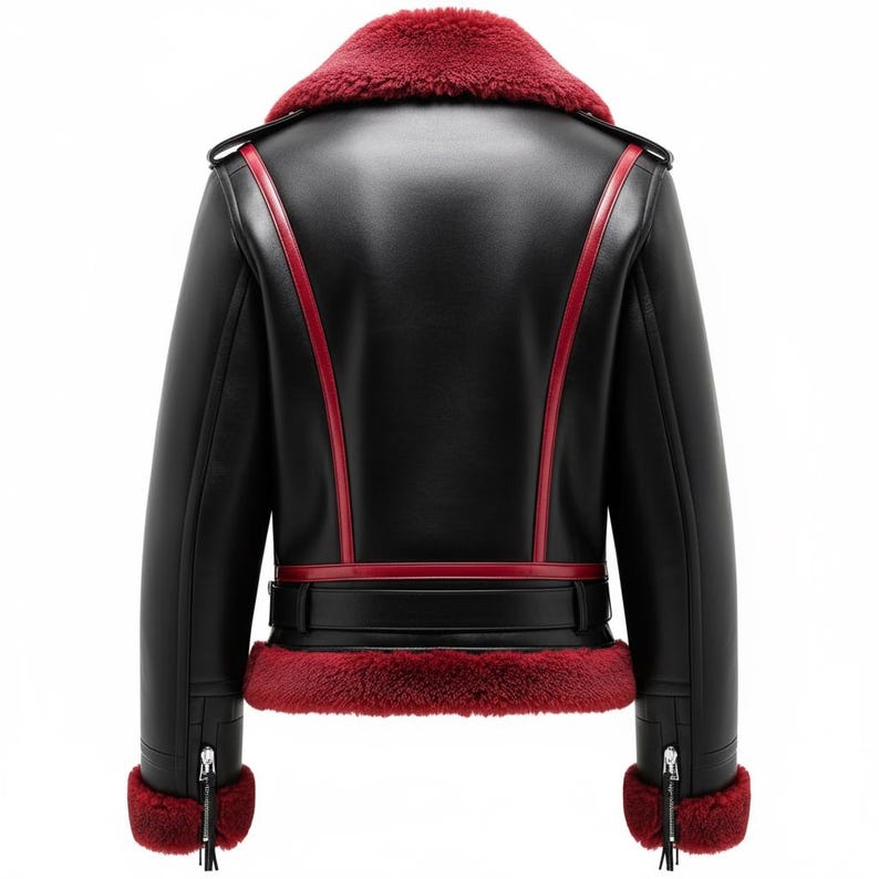 The Women’s Maroon Black B3 Genuine Sheepskin Classy Warm Crossover Sherpa Shearling Faux Fur Collar Flying Zip-up Aviator Leather Jacket seamlessly blends classic aviation elements with contemporary luxury. Crafted from maroon black genuine sheepskin, this jacket not only ensures optimal warmth but also exudes a sophisticated flair. The standout feature, a crossover Sherpa Shearling faux fur collar, adds a dramatic touch of elegance, making it perfect for colder climates. An asymmetric front YKK zipper closure and strategically placed slanted zipper pockets combine functionality with fashion. Sherpa Shearling faux fur-lined cuffs and hem complete the design, offering additional insulation and a luxurious feel.”