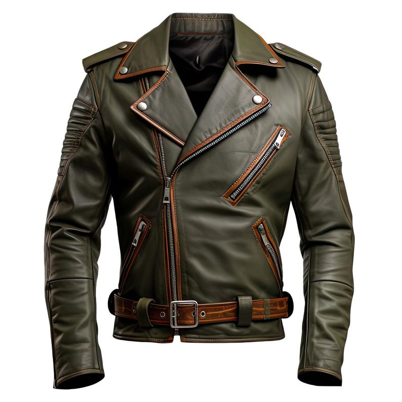 The Men’s Army Green Genuine Sheepskin Notch Lapel Collar Military Style Classy Casual Asymmetric Crossover Leather Jacket is a perfect blend of rugged military charm and contemporary fashion. Crafted with luxurious genuine sheepskin leather, it promises both longevity and comfort. The jacket’s notch lapel collar and asymmetric YKK zipper closure infuse a modern twist into the classic military design, making it a standout piece. The adjustable waist buckle belt ensures a perfect fit, enhancing the jacket’s structured look. Quilted details on the sleeves and shoulder straps not only add an element of sophistication but also provide additional warmth and comfort.”