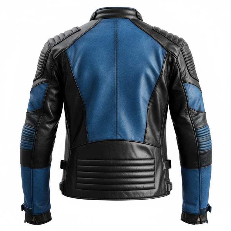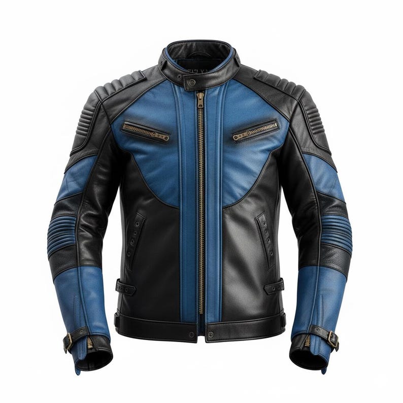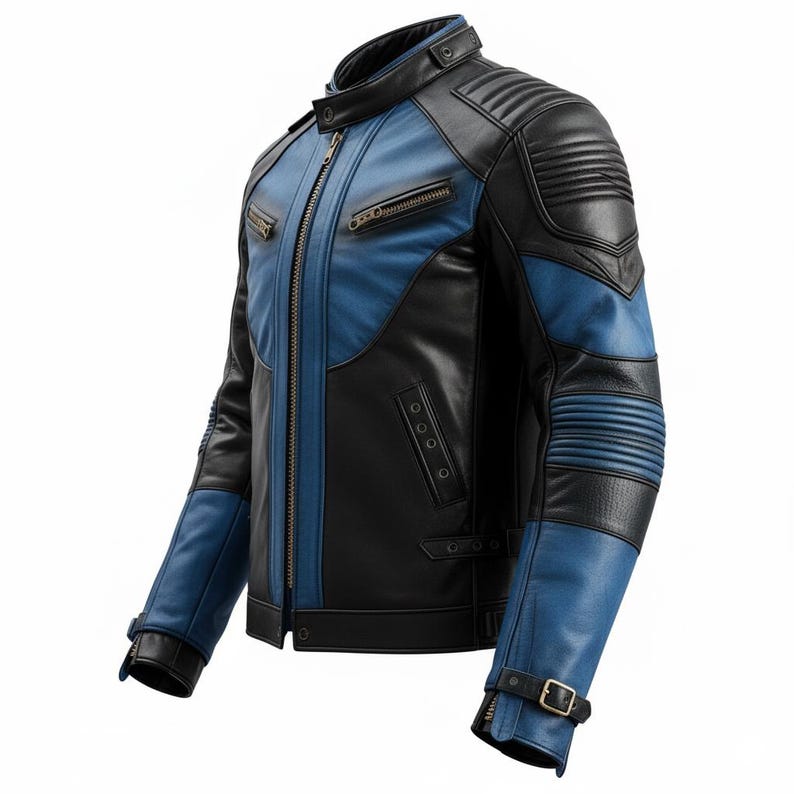 “Men’s Black Blue Genuine Sheepskin Lightweight Punk Racing Outfit Classy Quilted Smooth Zippered Motorcycle Leather Jacket. Constructed from high-quality genuine sheepskin leather, this jacket offers a comfortable, lightweight fit without compromising on warmth. The striking black and blue hues, combined with the elegant stand collar with snap closure, create a look that is both commanding and chic. The quilted detailing on the shoulders and sleeves provides extra insulation and an edgy aesthetic that stands out on the track or the street. With its multiple pockets and smooth YKK zipper, this jacket pairs practicality with an air of sophistication. Whether you’re a seasoned biker or simply appreciate a sharp, versatile leather jacket, this garment is designed to deliver style.