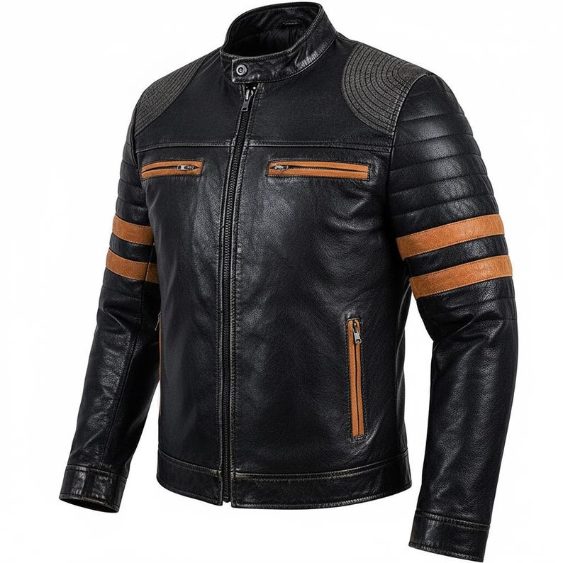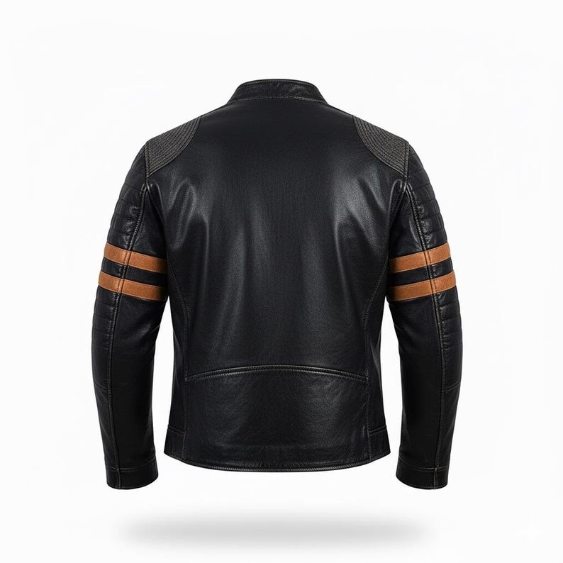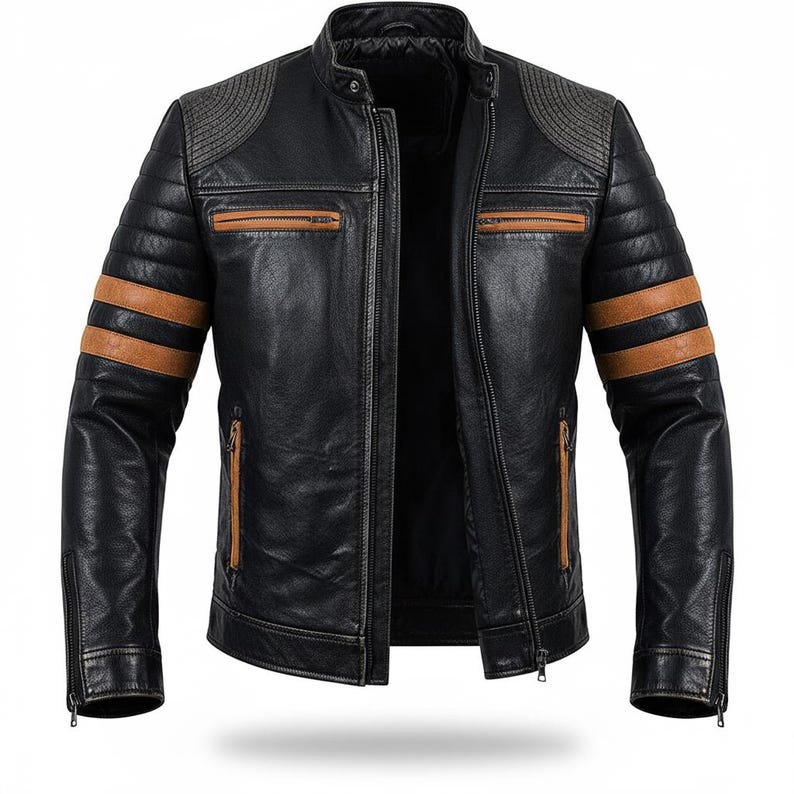 “Step into bold biker style with this men’s black leather moto jacket. Designed with a rugged cafe racer fit, this jacket features quilted shoulder detailing and vintage-inspired contrast racing stripes on the arms. Crafted for everyday wear, riding, or styling up an outfit, this piece blends durability, comfort, and standout character.