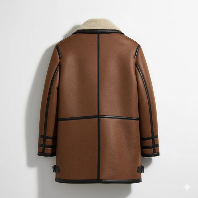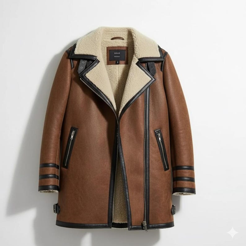 “Stay warm in timeless style with this brown shearling leather coat. Designed with a soft faux fur lining, contrast black trim, and long silhouette, it blends comfort with sophistication. Perfect for cold weather, this aviator-inspired jacket adds a rugged yet refined look to any outfit. Ideal for everyday wear, travel, or gifting this winter season.