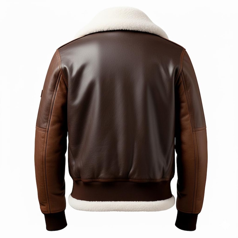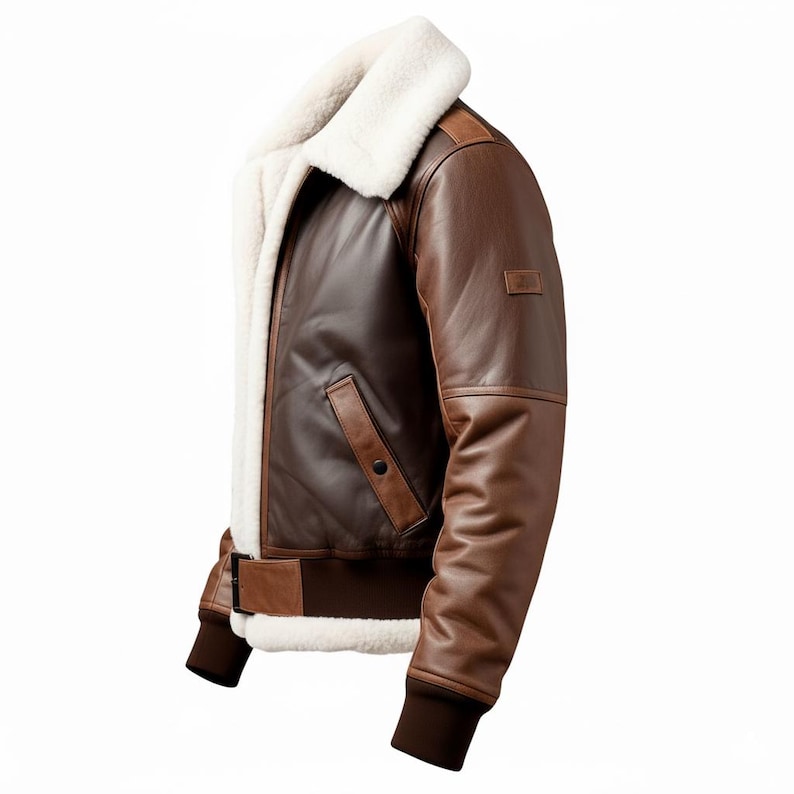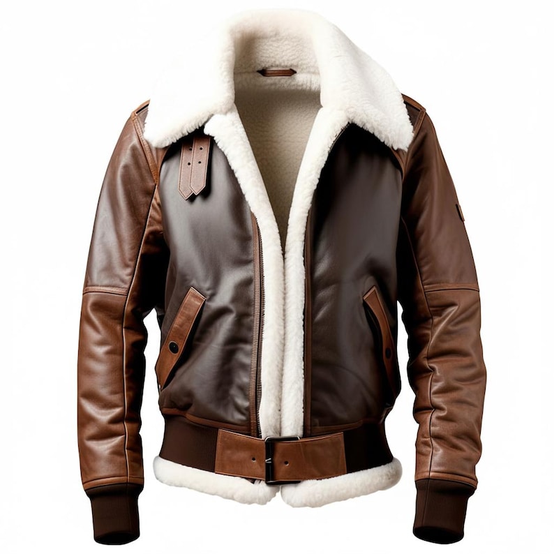 The Men’s Dark Brown White Genuine Sheepskin Sherpa Shearling Faux Fur Lined Flying Belted A2 Aviator Bomber Leather Jacket. This luxurious piece is meticulously crafted from the finest dark brown and white genuine sheepskin leather, featuring a Sherpa Shearling faux fur shirt collar. The robust YKK zipper glides smoothly, securing the jacket and keeping the safe, while the slanted pockets ensure your valuables are always within reach. Rib-knitted cuffs and bottom hem with buckle closure not only enhance the jacket’s comfort but also accentuate its sophisticated silhouette. This bomber jacket is the perfect union of elegance and adventure.”
