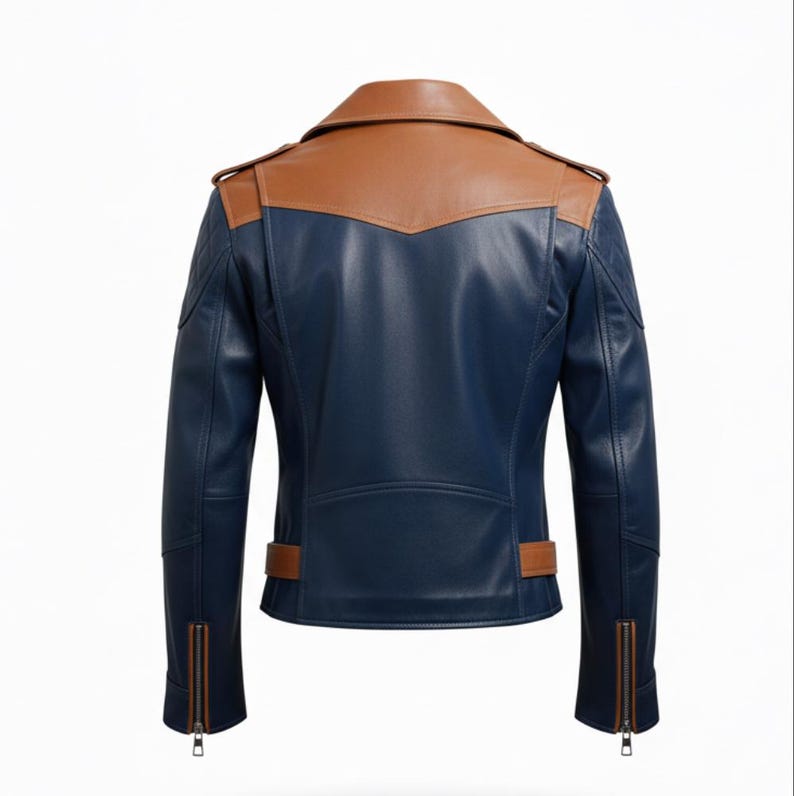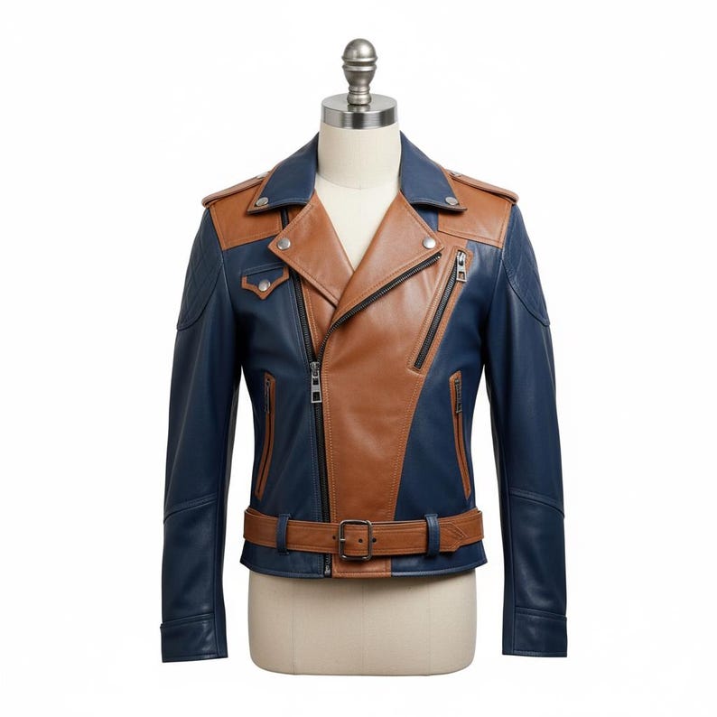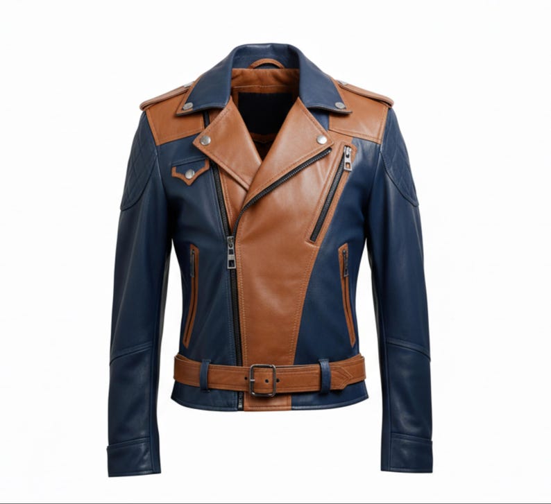 The Men’s Navy Blue Brown Genuine Sheepskin Notch Lapel Collar Asymmetric Crossover Belted Leather Jacket. This piece is expertly crafted from the finest genuine sheepskin leather, ensuring both longevity and a luxurious feel. The notch lapel collar adds a touch of classic elegance, while the unique asymmetric YKK zipper closure infuses modern flair into the design. The adjustable waist belt allows for a tailored fit, accentuating the sleek silhouette of the jacket. Multiple zipper pockets not only offer practicality but also contribute to the jacket’s stylish and contemporary appearance. Perfect for those seeking a fusion of classic elegance and modern.”