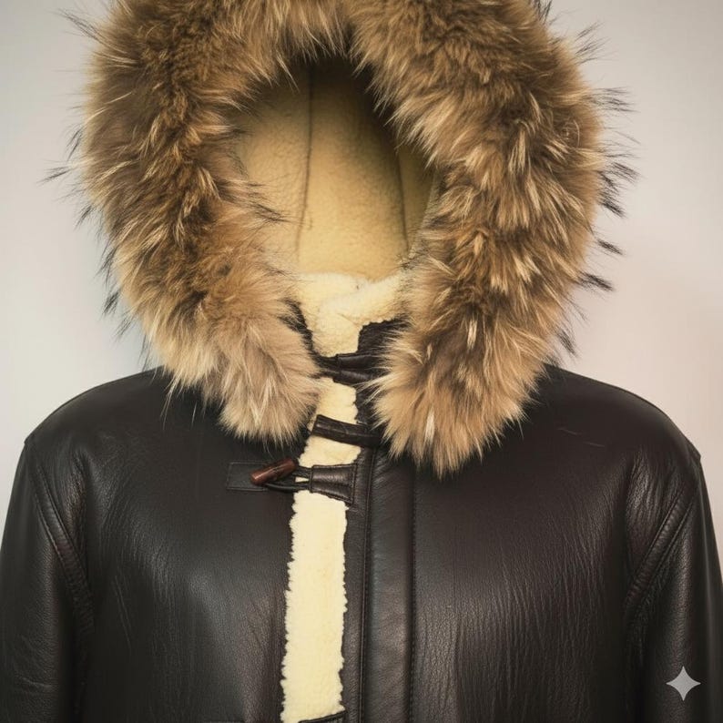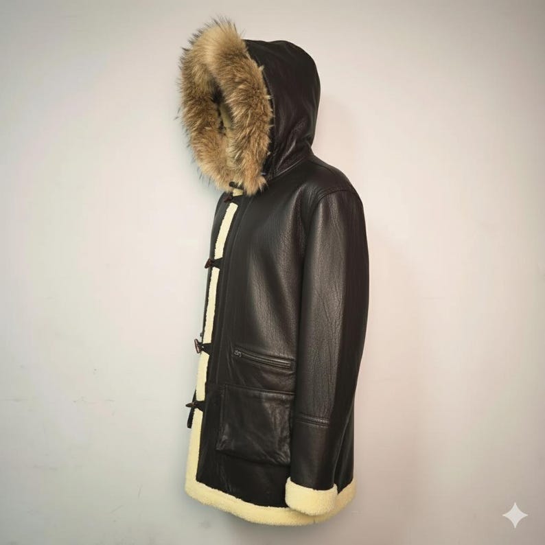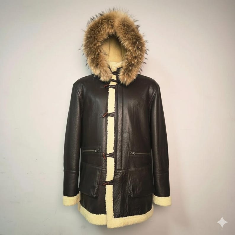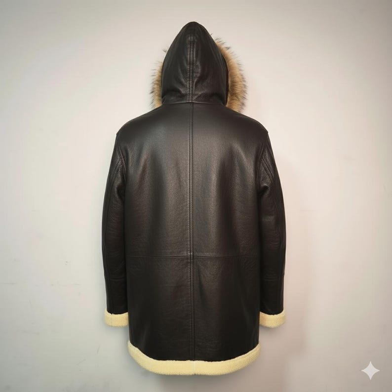 “Stay warm and stylish all season long with this luxurious men’s shearling leather parka. Expertly handcrafted from premium genuine leather and lined with soft, insulating sheepskin, this coat combines timeless craftsmanship with modern comfort. The rich brown leather exterior contrasts beautifully with the cream shearling lining and plush fur hood, offering both elegance and practicality for the coldest days.