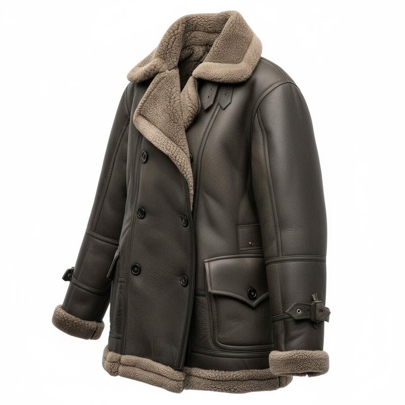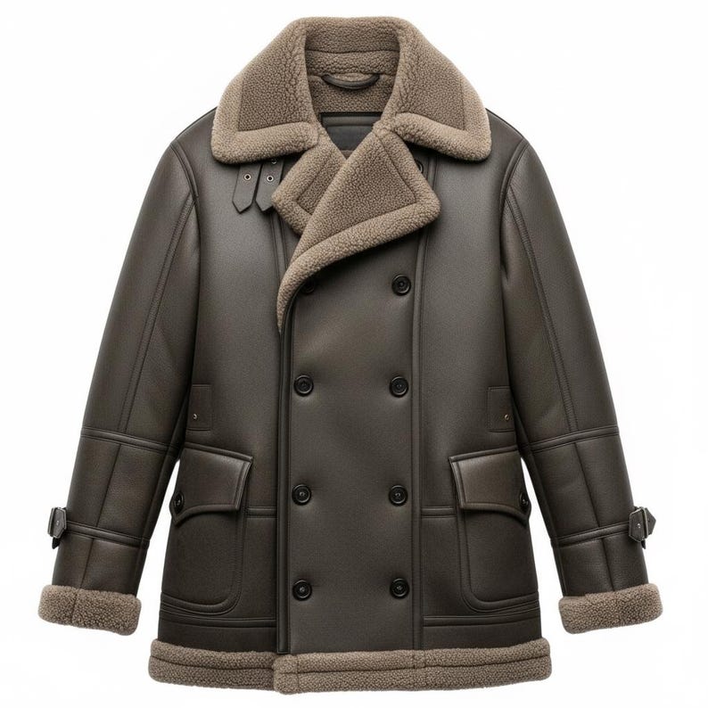 “Elevate your winter wardrobe with this luxury men’s shearling peacoat. Crafted from premium real leather and lined with thick, soft shearling, this coat provides exceptional warmth and durability. The double-breasted button design, wide fur collar, and aviator-style cuffs deliver a timeless, masculine look inspired by classic B3 bomber jackets.