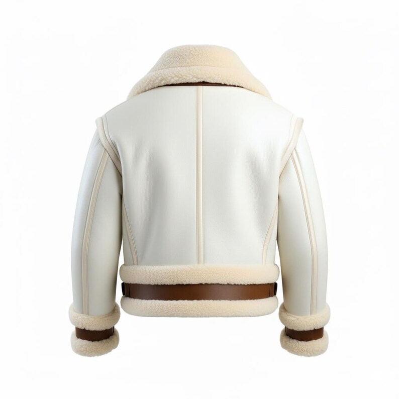 The Men’s White Genuine Sheepskin Sherpa Shearling Faux Fur Lined Aviator Flight Pilot Winter Warm B3 Bomber Leather Jacket. This immaculate white jacket is constructed from authentic sheepskin leather, promising durability and a touch of luxury. Inside, you’ll find it lined with sumptuous Sherpa Shearling faux fur that keeps the winter chill at bay. Beige stripes add a fashionable contrast, while the waist belt offers adjustable comfort and a classic silhouette. The front YKK zipper ensures ease of wear, and the side waist pockets provide convenient storage.”