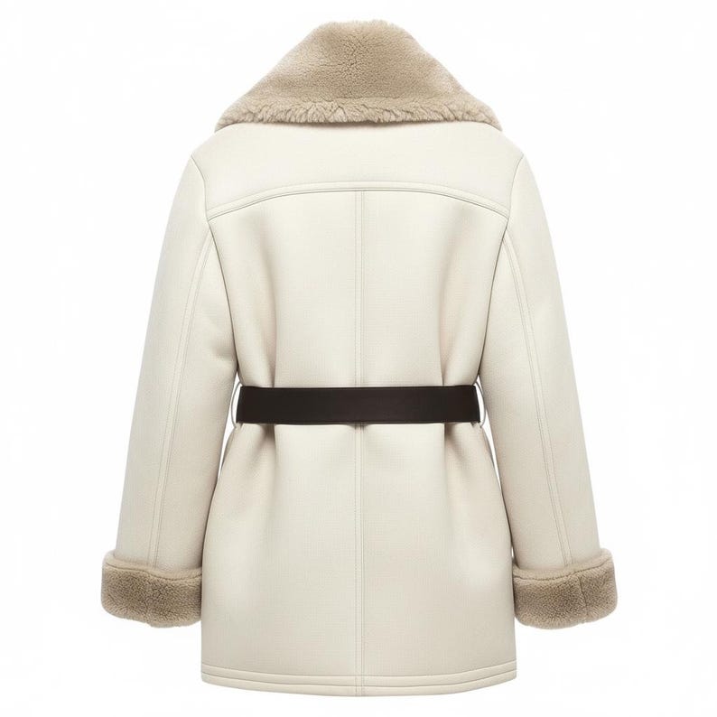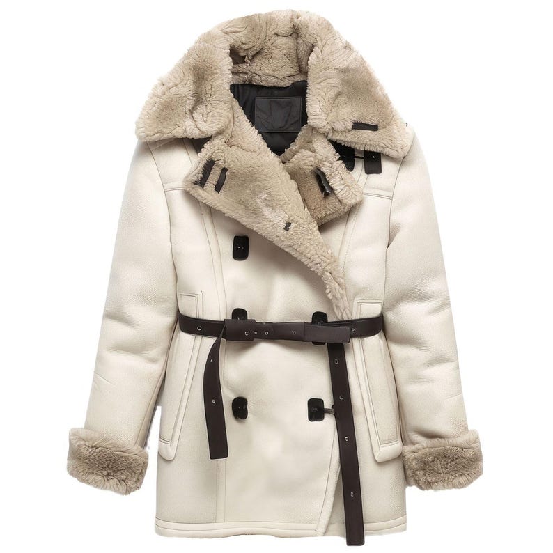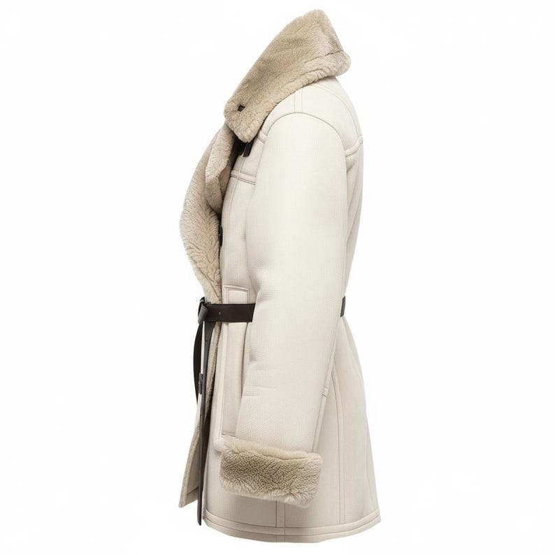 “The Women’s Beige Genuine Sheepskin Elegant Asymmetric Formal Wear Sherpa Shearling Faux Fur Collar Mid-Length Trench Leather Coat is a masterpiece of craftsmanship and style. Made from high-quality genuine sheepskin, it not only ensures longevity but also exudes luxury. The coat’s Sherpa shearling faux fur lapel collar introduces a touch of sophistication, making it an ideal choice for cooler weather. The double-breasted button closure and adjustable waist belt enhance its classic trench coat silhouette, offering a customizable fit. Side pockets add functionality to this elegant piece, while its mid-length design provides versatility in wear.