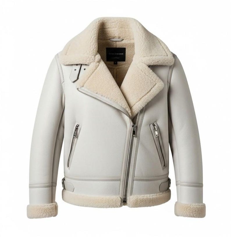 “Women’s Creamy White Aviator Genuine Sheepskin Sherpa Shearling Faux Fur Winter Warm Casual Bomber Flight Pilot Leather Jacket. Crafted from top-grade sheepskin and lined with cozy faux fur Sherpa shearling, this jacket promises unparalleled quality and warmth. The modern design features a chic lapel collar and a distinctive oblique YKK zipper closure, while the YKK zipper pockets provide a practical solution for keeping your essentials secure. Perfect for creating a casual or pilot-inspired look, this leather jacket is a timeless addition to your winter wardrobe.